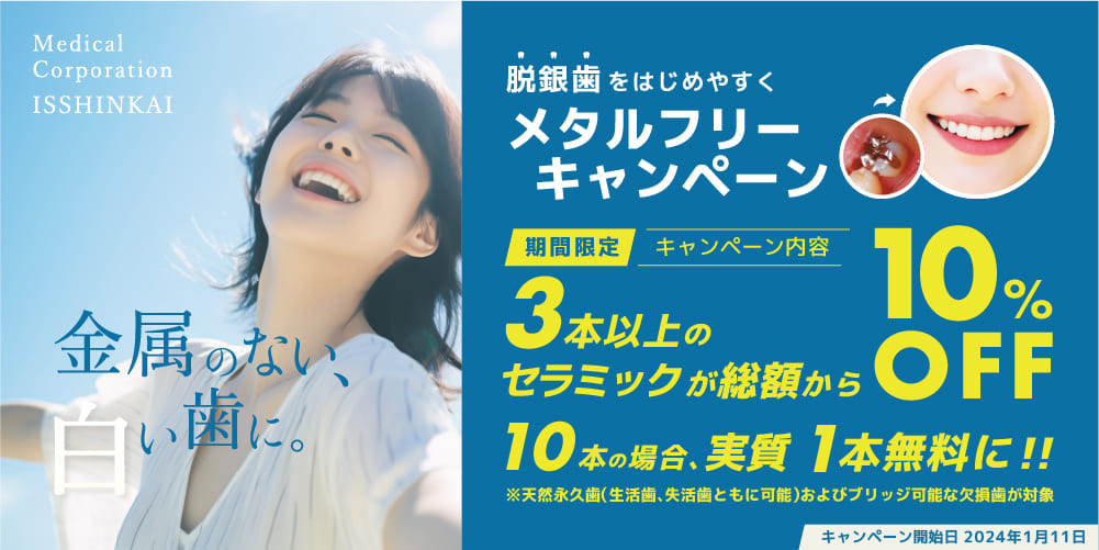お口の中の金属修復物を、「より生体親和性の高いセラミック」に変え、患者様に健康的で美しい見た目をリーズナブルに提供する特別キャンペーンです。